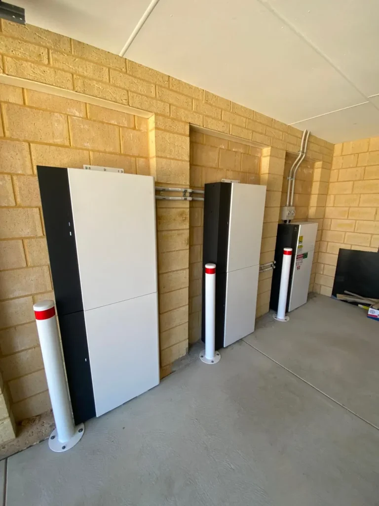 The battery units and inverter were installed neatly along the garage wall, positioned to allow proper airflow, safe access, and straightforward future servicing. Bollards were added in front of the system to protect the equipment from vehicle impact, ensuring long-term durability.