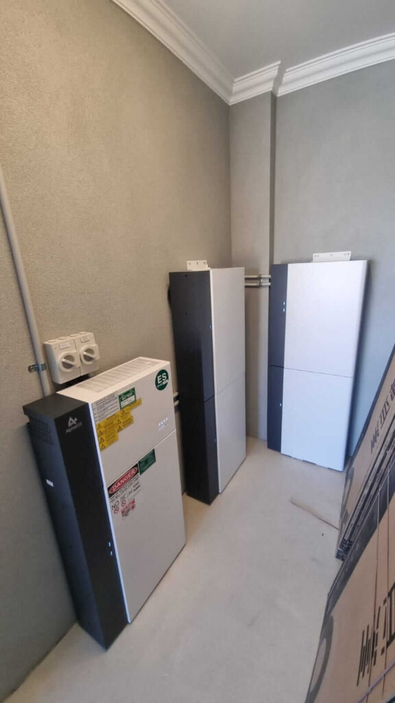 The battery units were fitted neatly along the internal wall, spaced for ventilation and future service access. All conduits are routed cleanly overhead and across the wall, keeping the setup tidy and compliant with current installation standards.