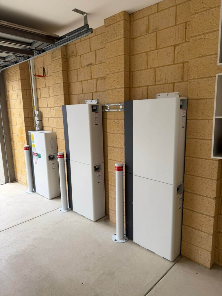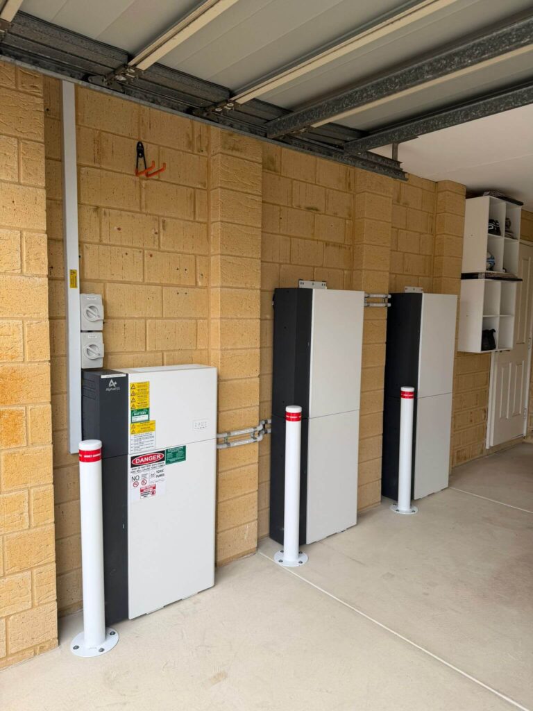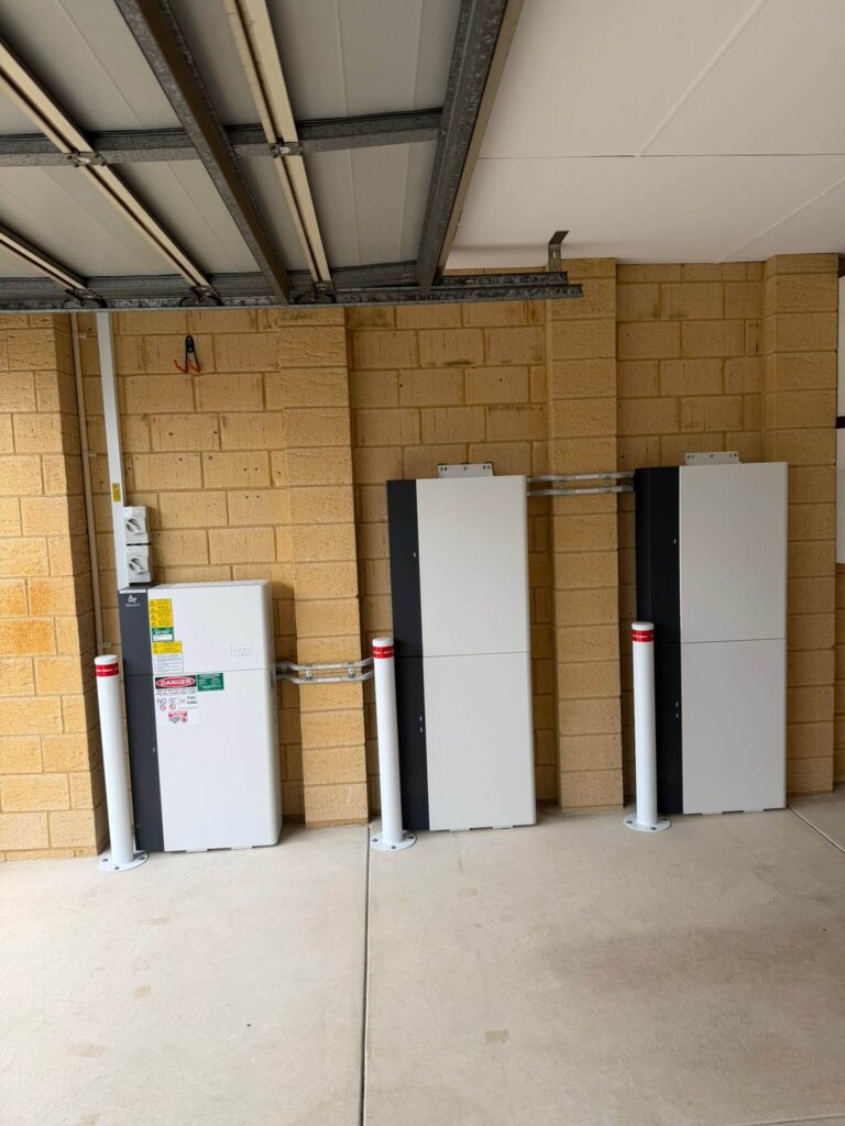 Inside the garage, the battery units were positioned along the wall with appropriate spacing for airflow, maintenance access, and compliance. Conduit runs were planned carefully to keep the installation tidy and symmetrical, with protective bollards added for safety.