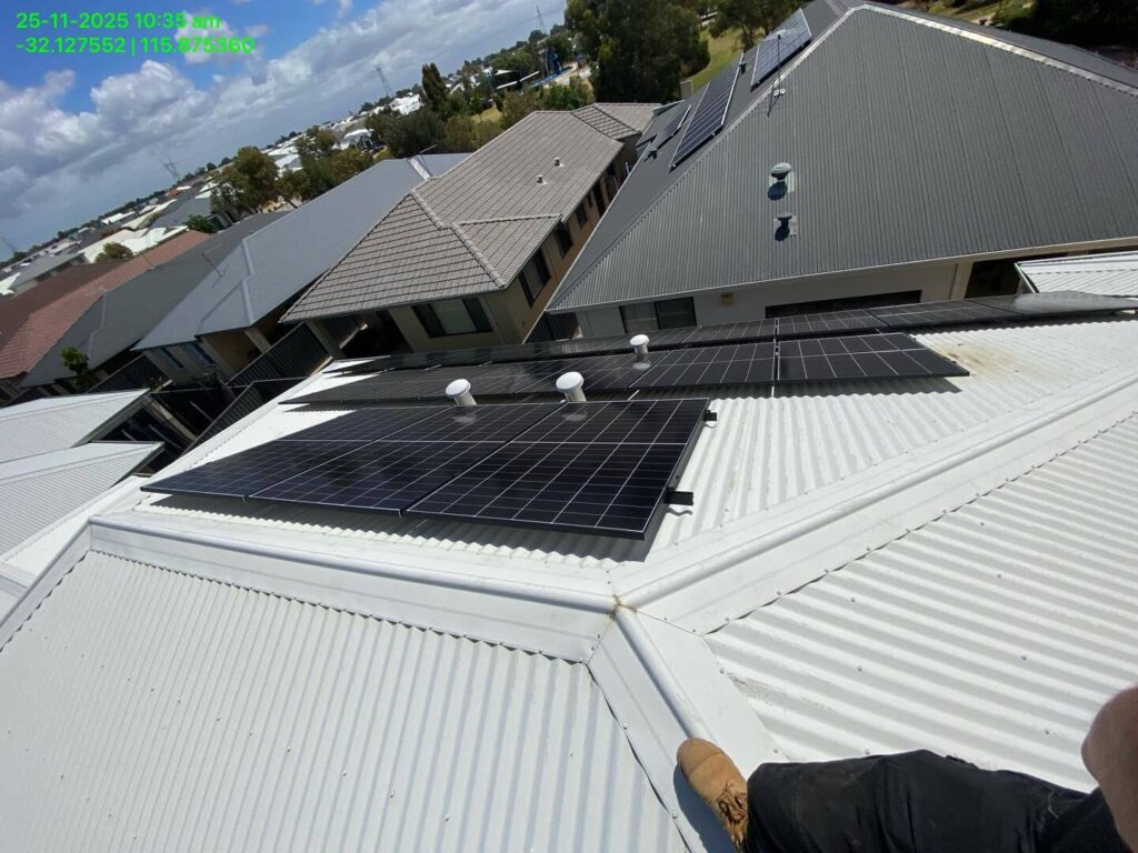 To maximise efficiency, the solar panels were installed across multiple roof sections with clean exposure to the sun. The layout takes advantage of long roof runs to keep cabling neat and minimise shading risk. All mounting hardware was selected to suit the metal roof profile and to maintain structural integrity.