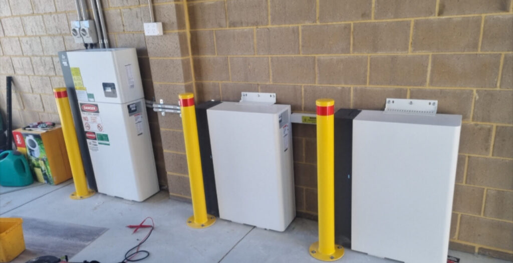 The installation is neatly executed, with wall-mounted battery units, protected cabling, and safety bollards ensuring both functionality and durability. Combined with the sleek rooftop solar array, the system delivers not only high performance but also a clean, professional aesthetic.